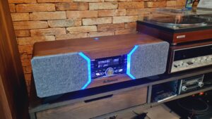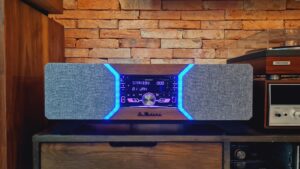 - Thiết kế: Vuông vắn nhưng hoài niệm của những chiếc đài redio cổ, kết hợp với chất liệu gỗ và lưới ê căng mang đến sự hiện đại nhẹ nhàng, tạo điểm nhấn cho không gian nội thất trong nhà bạn bên cạnh chức năng chính là chiếc máy hát với đầy đủ kết nối như: CD, giắc 3.5, USB, Bluetooth.