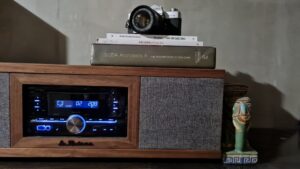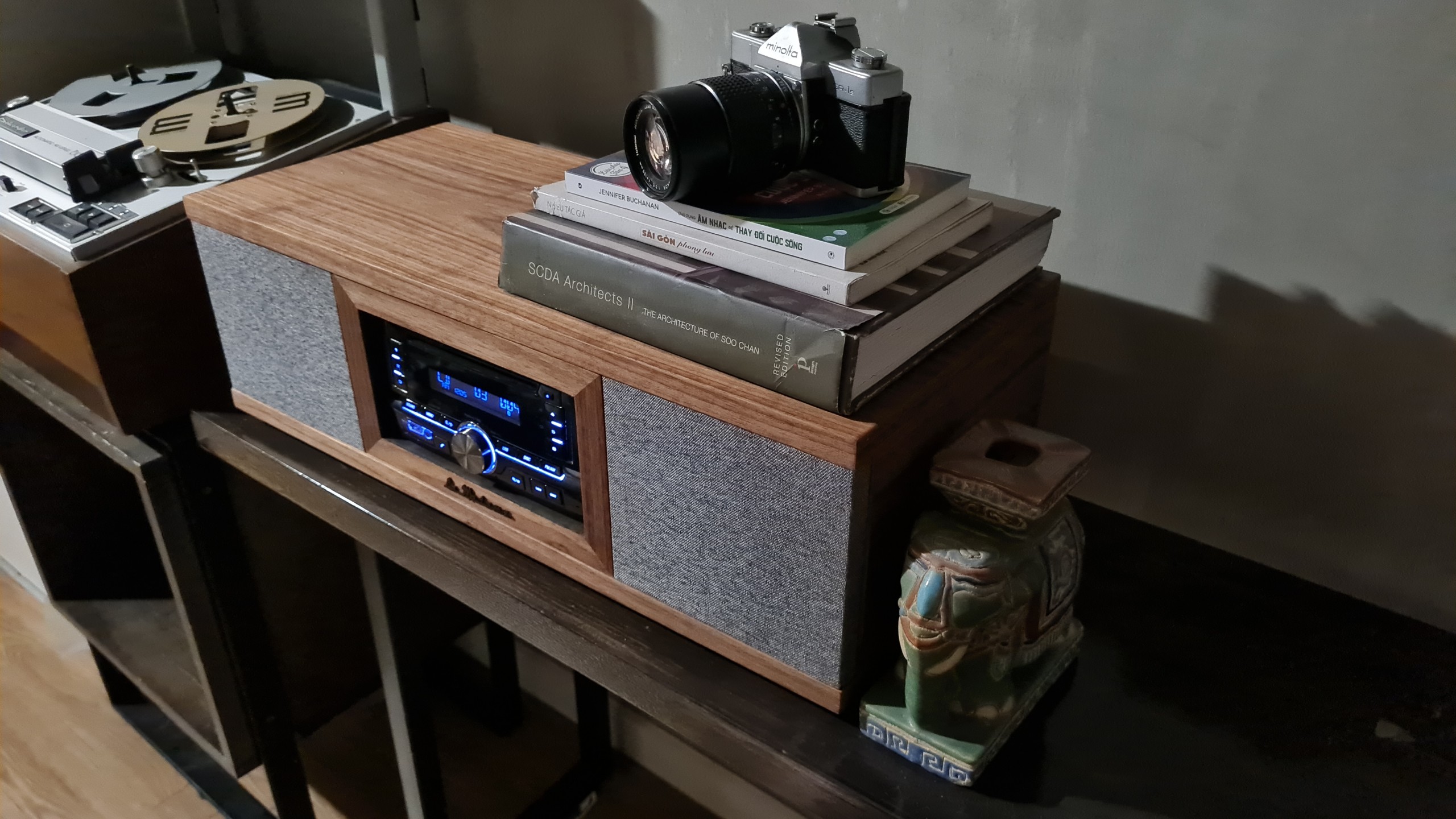 - Thiết kế: Vuông vắn nhưng hoài niệm của những chiếc đài redio cổ, kết hợp với chất liệu gỗ và lưới ê căng mang đến sự hiện đại nhẹ nhàng, tạo điểm nhấn cho không gian nội thất trong nhà bạn bên cạnh chức năng chính là chiếc máy hát với đầy đủ kết nối như: CD, giắc 3.5, USB, Bluetooth.